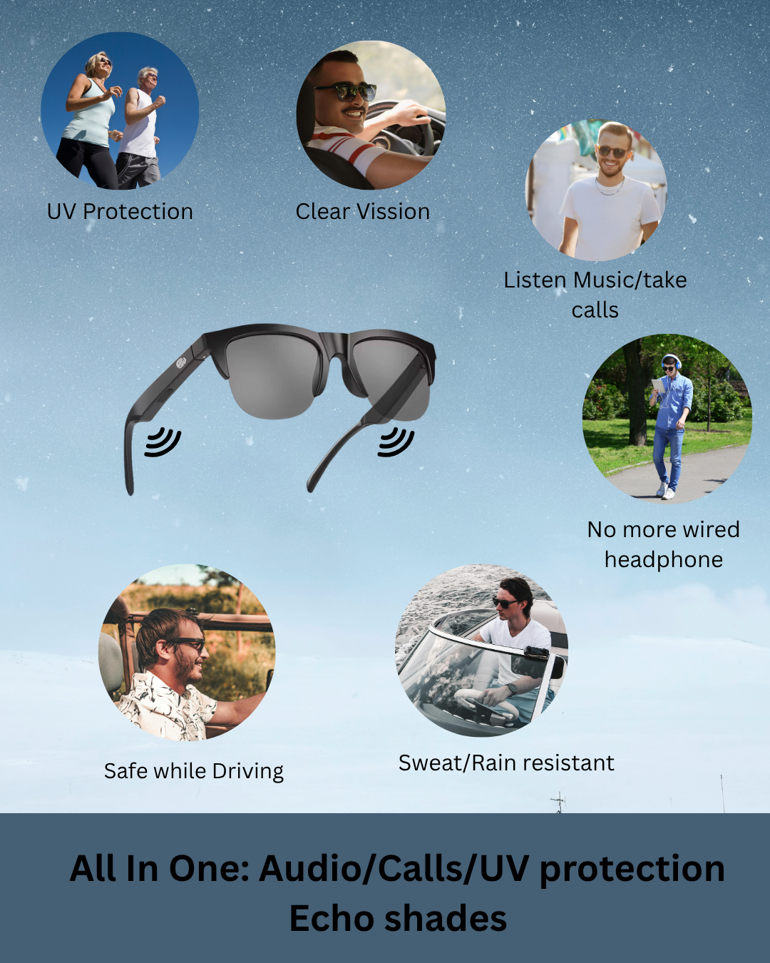 Whether you're cycling, commuting, hiking, or just chilling outdoors, EchoShades™ deliver wireless freedom and crystal-clear sound without compromising on style or comfort.