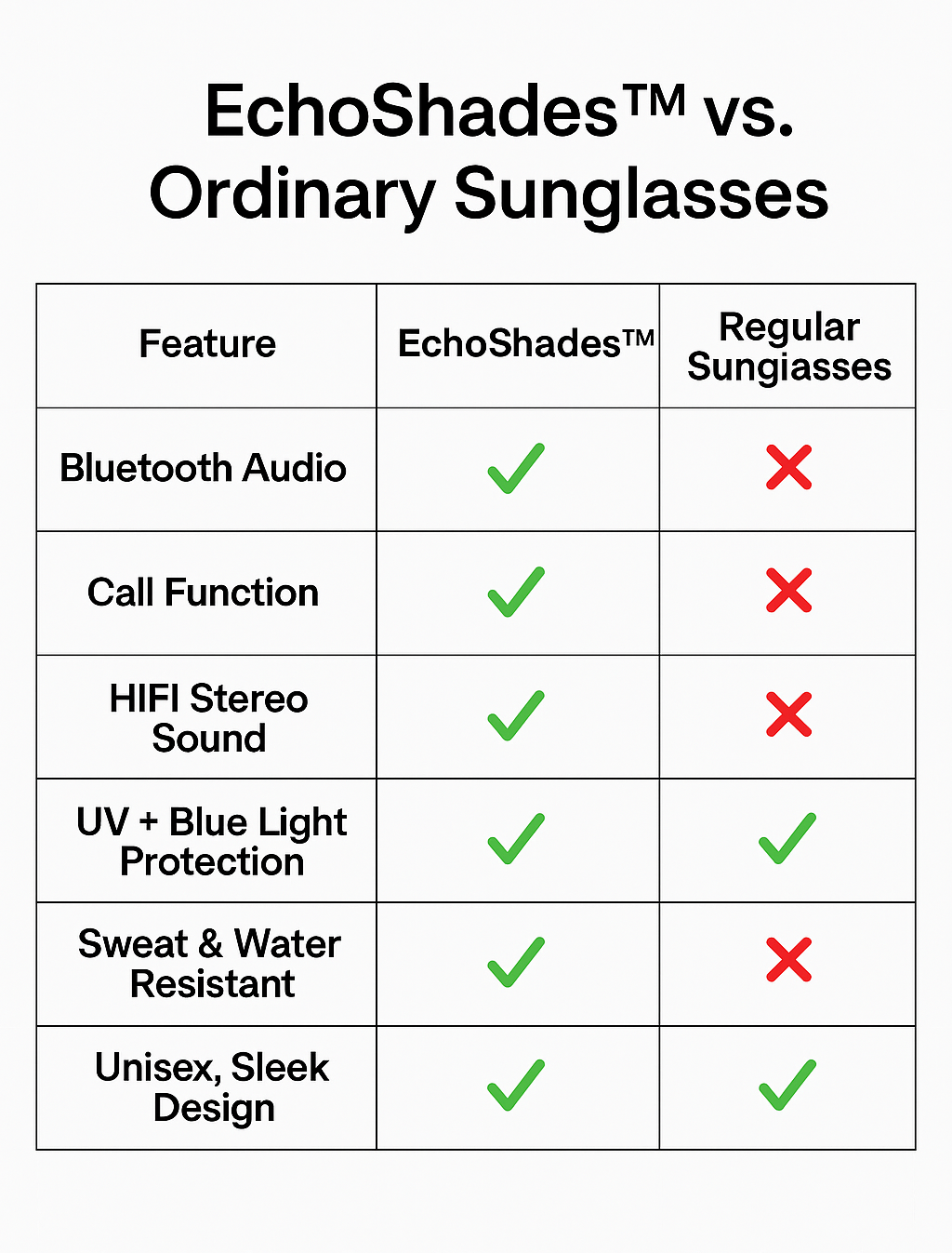 EchoShades™ are more than eyewear—they’re smart, stylish, and built for modern living. While regular sunglasses stop at UV protection, EchoShades™ go further with built-in Bluetooth audio, call functionality, and HIFI stereo sound—all while keeping your eyes shielded and your style sharp.